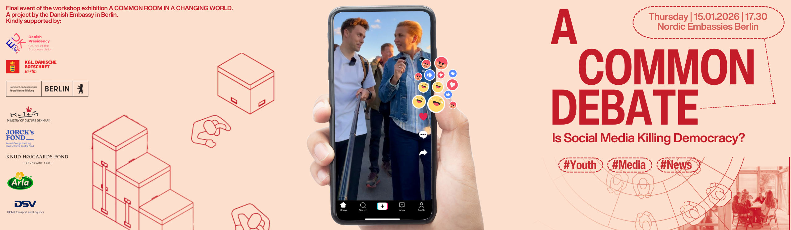 Der Abend bildet den Abschluss der Workshop-Ausstellung »A Common Room in a Changing World« der Dänischen Botschaft. Partner der Veranstaltung ist die Berliner Landeszentrale für politische Bildung.